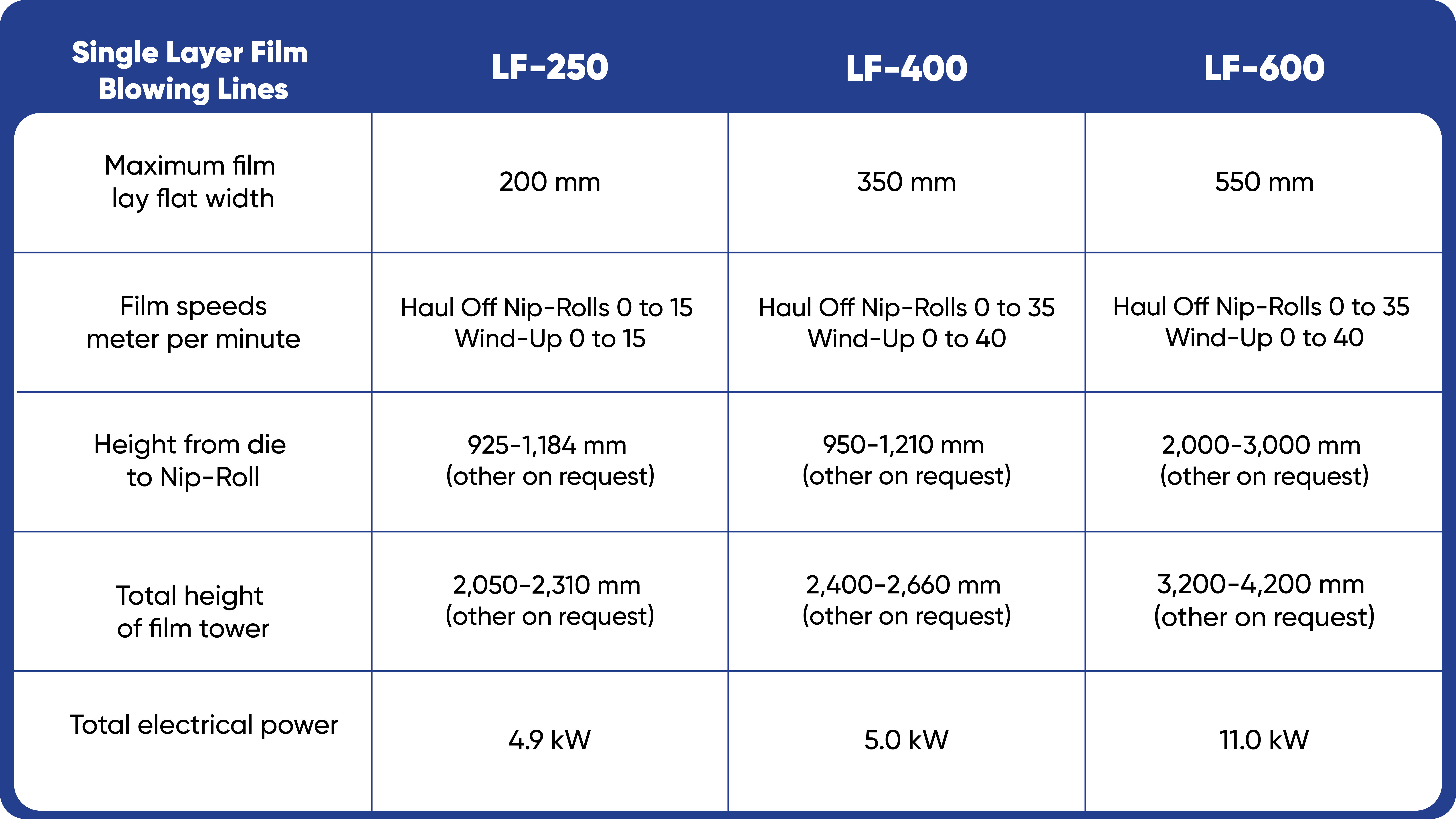 Líneas de soplado de una o varias capas para anchos de burbuja de hasta 550 mm, con muchas características, tales como anillo de enfriamiento de aire de doble canal, sistema arrastre de velocidad variable, nip rolls, etc.